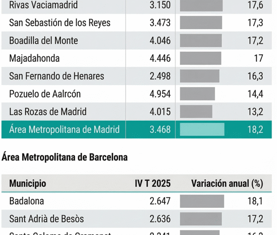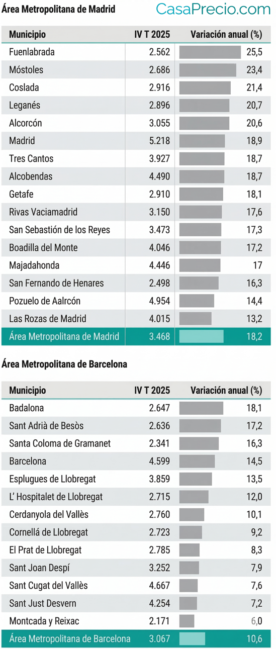 Uno de los fenómenos más destacados es cómo la demanda, expulsada por los precios del centro, está tensionando los municipios colindantes. En Madrid, ciudades como Fuenlabrada (+25,5%) y Móstoles (+23,4%) crecieron incluso por encima de la capital.